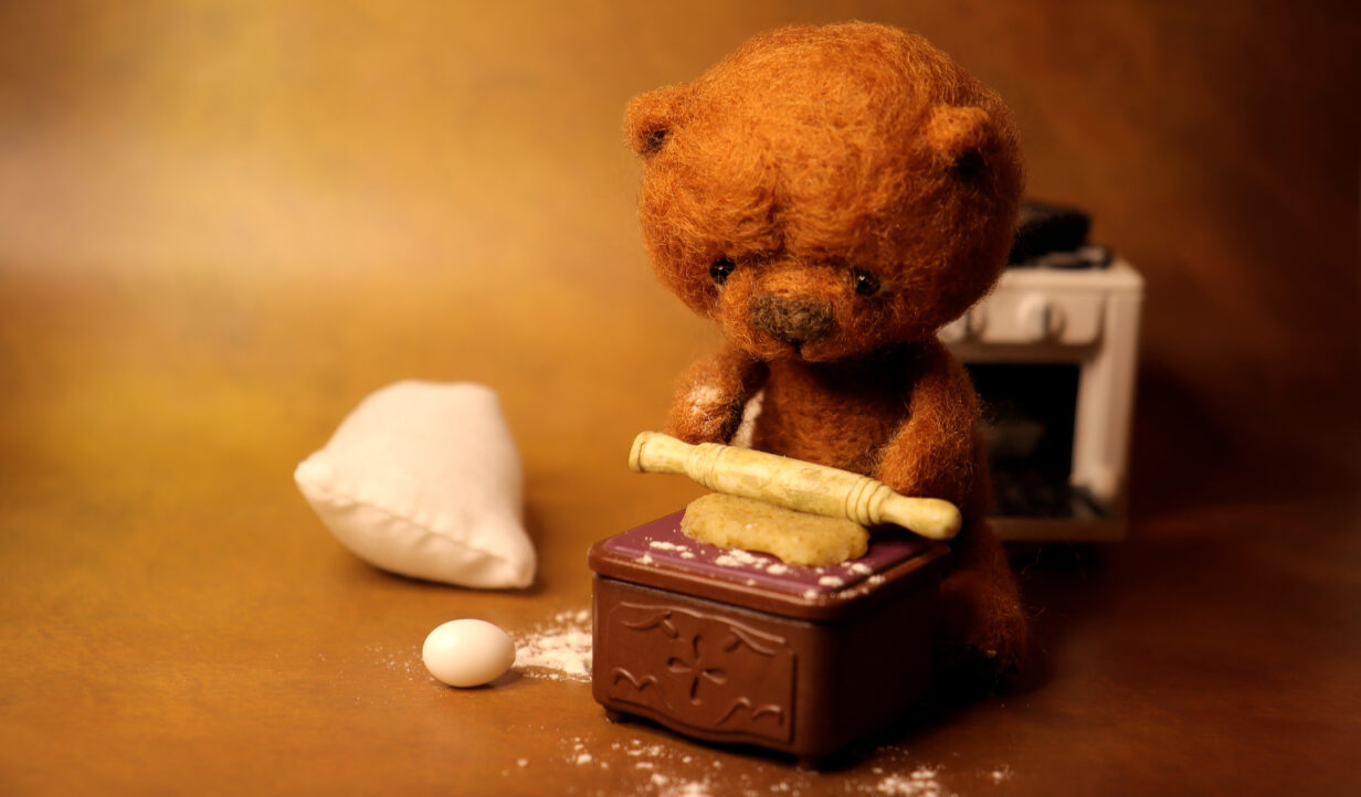 Filznadel, gefärbte Schafwolle, Glasaugen und Garn – mehr braucht es nicht, um einem kleinen Teddybär das Leben zu schenken. In liebevoller Handarbeit entstehen sie durch stundenlanges Bearbeiten von Schafwolle mit einer groben und einer feinen Filznadel. Die inneren Werte sind bei fast allen Teddys Fadengelenke aus Zahnseide, wodurch sie in ihrer Position verändert werden können und zart nach Minze duften, Glasaugen und ein Mund aus Nähgarn. Auch wenn bei allen das Ausgangsmaterial gleich ist, ist jeder von ihnen einzigartig in Form, Farbe und Aussehen – ein echter Künstlerbär eben.
